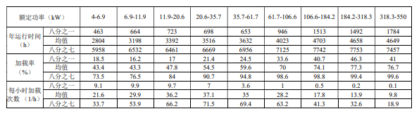 盡管壓縮機(jī)會(huì)被應(yīng)用于許多不同場合,但是基于實(shí)際收集的數(shù)據(jù),還是可以定義典型 的運(yùn)行特征和趨勢。對于這 3 萬多 臺(tái)壓縮機(jī)的每條記錄,都定義了三個(gè)關(guān)鍵值:年運(yùn)行 時(shí)間、加載率和每小時(shí)加載次數(shù),并將這些記錄按額定功率進(jìn)行了分組。 對于每一組壓 縮機(jī),都計(jì)算了平均值,并列出八分之一和八分之七的值,對應(yīng)總量的 12.5%和 87.5%。