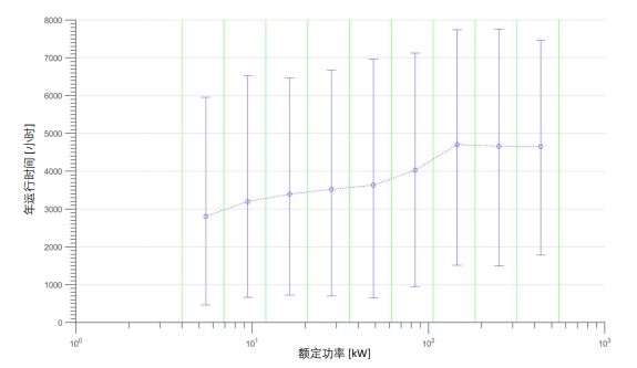 圖 2 顯示了按額定功率分組的年運(yùn)行時(shí)間。很明顯,藍(lán)圈標(biāo)識(shí)的平均年運(yùn)行時(shí)間相對 較少,從所有分組(由綠色豎線分隔)看,該平均值是介于 2,804 - 4,703 小時(shí)之間(見表 1)。另外,一個(gè)明顯趨勢是額定功率越大運(yùn)行時(shí)間越長,但是超過 100kW 之后則趨于穩(wěn) 定。另外,八分之一和八分之七所覆蓋的范圍差別也是極大的,推測是因?yàn)榭蛻魬?yīng)用多變導(dǎo)致的。